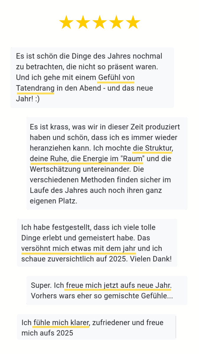 Du kannst deine Jahreswechsel Reflexion also auch unabhängig vom Live Termin machen, wann es dir am besten passt.